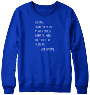 DEAR MUM THANKS FOR PUTTING UP WITH A SPOILED BRATTY CHILD MENS LADIES WOMENS UNISEX SWEATSHIRT SWEATER
