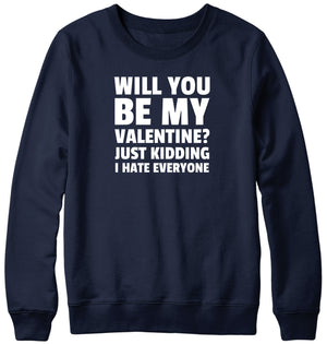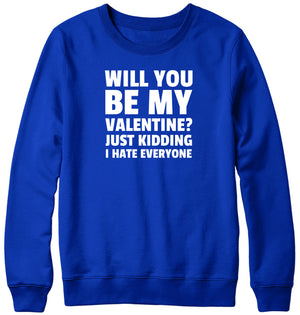WILL YOU BE MY VALENTINE? JUST KIDDING I HATE EVERYONE MENS LADIES WOMENS UNISEX SWEATSHIRT SWEATER
