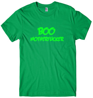 'BOO Motherfucker' the better way off saying 'Happy Halloween'. Get this men's fit t-shirt and greet people the right way this season. Available in a choice of 9 shirt colours this tee comes with a bright green print. Sizes available from Small - XXL. This shirt is 100% Cotton.