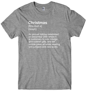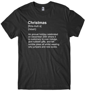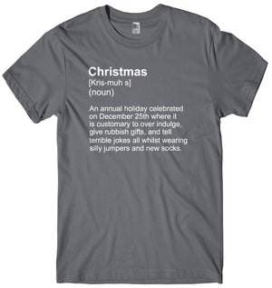 Christmas (Kris-muh-s)(noun) - This 'meaning of Christmas' T-Shirt sums up Christmas day perfectly with the over indulging, the rubbish gifts & the silly jumpers & socks. After all, they are all the reasons why we just love Christmas!