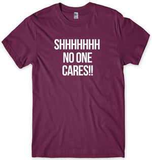 SHHH NO ONE CARES - Everyone has been there.....You get caught talking to someone and the conversation goes on and on and on and you really couldn't care less what they are telling you! Yeah, this T-Shirt has been specifically designed for moments like that!