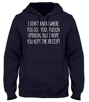 I DON'T KNOW WHERE YOU GOT YOUR OPINION BUT I HOPE YOU KEPT THE RECEIPT MENS WOMENS UNISEX FUNNY HOODIE