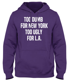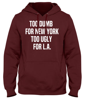 TOO DUMB FOR NEW YORK TOO UGLY FOR LA MENS WOMENS UNISEX FUNNY HOODIE