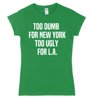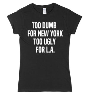 Too Dumb For New York Too Ugly For LA Womens Ladies Funny Slim Fit T-Shirt
