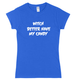 WITCH BETTER HAVE MY CANDY - Or I'll put a spell on you! No seriously, it's Halloween, it's the one night of the year that we can eat as much candy as possible so Witches need to play the game! This funny Halloween T-Shirt features a White print and is available on a choice of 6 shirt colours.