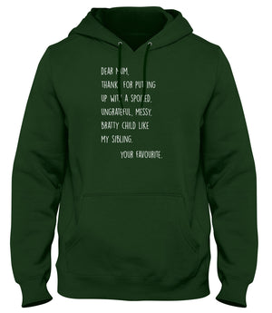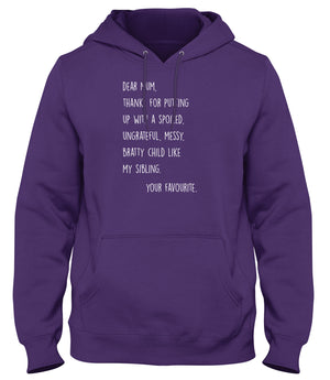 DEAR MUM THANKS FOR PUTTING UP WITH A SPOILED BRATTY CHILD MENS LADIES WOMENS UNISEX HOODIE