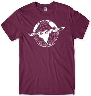A T-shirt fit for any Super Hero Buff. This Men's fit T-Shirt comes with a white print featuring a globe and the words 'Stark Industries' Los Angeles, California. Available in a choice of 4 shirt colours and with sizes ranging from Small - XXL. This Tee is 100% Cotton.